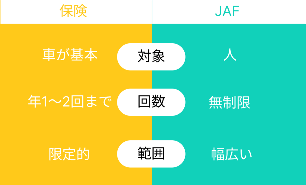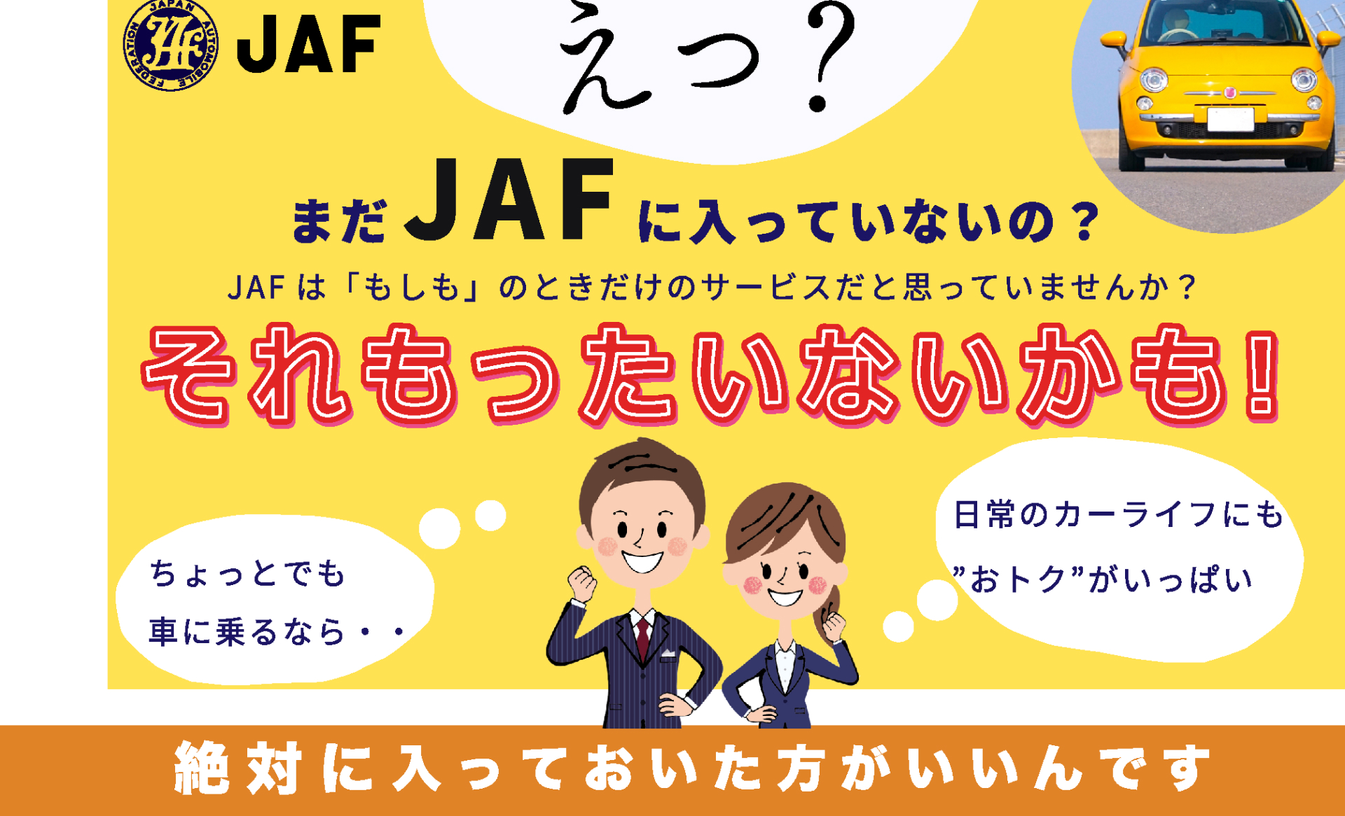 例えば、こんなトラブルない? \ 24時間365日!/ 全国どこでもすぐ駆け付け! 保険のロードサービスではカバーしきれない 「パンクの応急修理」や「自然災害に起因した事故・故障」をJAFなら回数無制限&完全無料で対応! 体験談 「深夜の高速でパンクに気づき、すぐにJAFを呼びました。 牽引と同時にレンタカーまで手配してくれて、本当に助かりました!」 大雨の日に整地されたばかりの土地に車を停めたところ、ぬかるみにハマって動けなくなってしまいました。JAFに連絡すると15分で現場に到着し、迅速に車を救出。会員であったため、費用は無料でした。非会員であれば約25,000円の費用がかかる可能性があったとのことです。 スノーハイク中に雪道で車がスタックしてしまった方は、JAFに救助を依頼。隊員は全輪にタイヤチェーンを装着し、牽引フックを使って車を安全な場所まで移動させました。作業は慎重に進められ、追加費用もかからなかったとのことです。 ある女性は、車のリモコンキーの電池が切れてエンジンがかからなくなりました。JAFに連絡すると、15~20分で到着し、電池を交換してエンジンを始動。非会員であったため、出動費用と電池代で合計10,500円の費用がかかりましたが、会員であれば無料で対応してもらえたとのことです。 使いこなせば 年会費以上に”お得”!! 年会費4,000円 こうしてカンタンに”元が取れる”! JAF会員は、レジャーから日常使いまで 全国47,000以上の施設で優待が受けられます ・ガソリンスタンド(ENEOS等)リッターあたり割引(例:2円引き)月50L給油 → 年間1,200円おトク ・ファミレス(ガスト・デニーズなど) 会計5〜10%OFF 月2回×800円利用 → 年間1,920円おトク ・レジャー施設(水族館・遊園地など) 入場料割引(200〜500円) 年3回家族で利用 → 年間1,200円おトク JAFと保険の違い 自動車保険+JAFご加入者必見優遇サービス適用 一般的な自動車保険 索引・搬送 100kmまで無料 バッテリー上がり 回数制限あり 燃料切れ 回数制限あり お得が広がるJAF会員特典 全国約47,000か所の施設に対応! 【料金プラン】 「私は運転に慣れているから大丈夫」? それが一番キケンかも!! ちょっとした不注意、運転歴30年でもトラブルは突然やってきます。 “使わない”のが理想でも“持ってない”のはリスクです。 あなたのカーライフに、もっと安心を。JAFに入るなら、今がチャンス! さらに詳しく見る